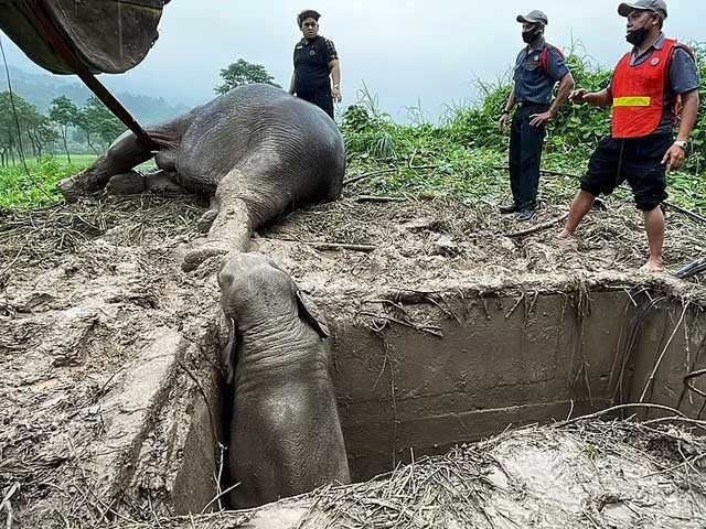 ایسا ہی ایک واقعہ تھائی لینڈ کے نیشنل پارک میں پیش آیا جہاں ایک ہتھنی گڑھے میں گرے اپنے بچے کو بچانے کی ہر ممکن کوشش کرتی ہے اور گڑھے سے نہ نکال پانے پر بے ہوش ہوجاتی ہے۔